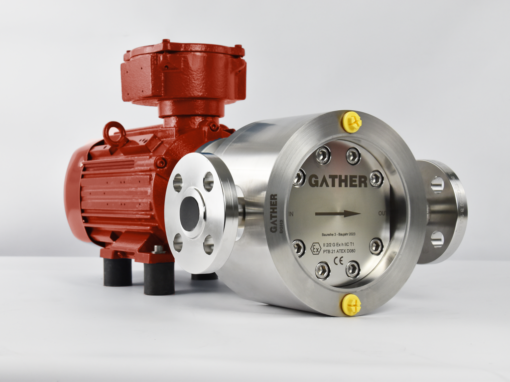 Die GATHER Begleitheizung gewährleistet durch die Strömung eines Heizmediums eine gleichmäßige Beheizung des Pumpenkopfes. Die Begleitheizung ist auf den Pumpenkopf leicht aufzustecken und zu montieren. Durch die entsprechende Konstruktion und Werkstoffauswahl – insbesondere im Bereich des Magnettopfes und der Dichtungen – ist die Edelstahlpumpe bis zu einem Systemdruck von 300 bar bei gleichzeitigen +450°C einsetzbar. Durch spezielle Verbindungsteile wird der Wärmeübergang zum Antrieb verringert.